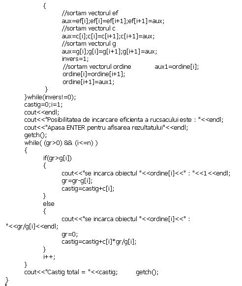 O persoana are un rucsac cu care poate transporta o greutate maxima G. Persoana are la dispozitie n obiecte si cunoaste pentru fiecare greutatea si castigul care se obtine in urma transportului sau la destinatie. Se cere sa se precizeze ce obiecte trebuie sa transporte persoana a.i. castigul sa fie maxim.