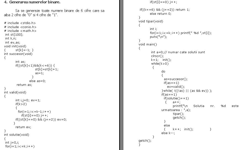 In continuare prezentam cateva probleme rezolvate in care folosirea metodei backtracking duce la obtinerea tuturor solutiilor dorite: